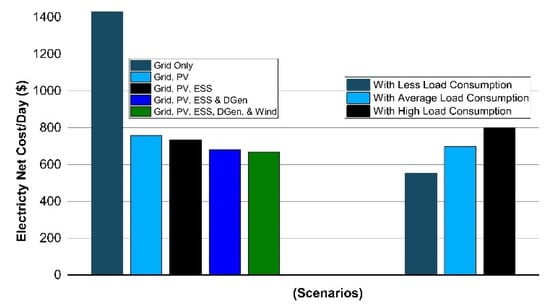 | Cases | Only Grid | PV | ESS | DG | Wind | Energy Import by Grid (kWh /Day) | Electricity Generated from Prosumer (kWh /Day) | Grid Electricity Net Cost/Day ($) * | CC ** ($/ Day) | Electricity Net Cost without CC/Day ($) 1 | Electricity Net Cost CC/Day ($) | LCOE ($/kWh) | % Saving |