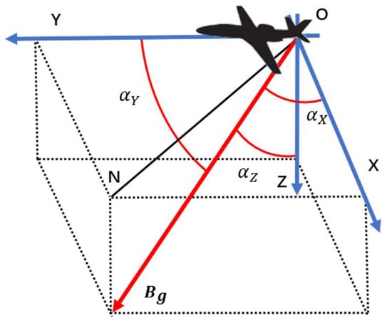 In this paper, a coordinate system is established with the position of the onboard magnetometer as the origin , as shown in Figure 1. The -axis points to the nose along the direction of the fuselage, the -axis is perpendicular to the fuselage downward, and the -axis, -axis, and -axis follow the right-hand rule. Among them, is the geomagnetic north, is the vector geomagnetic field, and , and are the angles between the geomagnetic field and the three axes of the platform coordinate system.