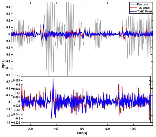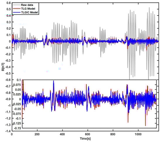 The compensation results of the first lap flight data using the two compensation models TLG and TLGIC are shown in Figure 2. The grey line is the filtered original magnetic field, the red line is the filtered compensation result of the TLG model, and the blue line is the filtered compensation result of the TLGIC model. The results show that two models can both obviously compensate the maneuver magnetic interference, but the compensation effect of TLGIC model is better. Then, the coefficients of two models solved in the first lap are used for the magnetic data of the second lap to verify their universality, and the results are shown in Figure 3. We can clearly see that the compensation effect of the TLGIC model is still better than that of the TLG model.