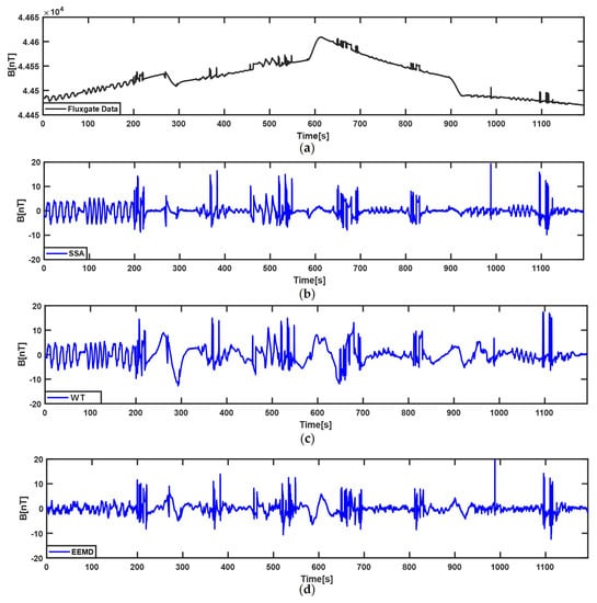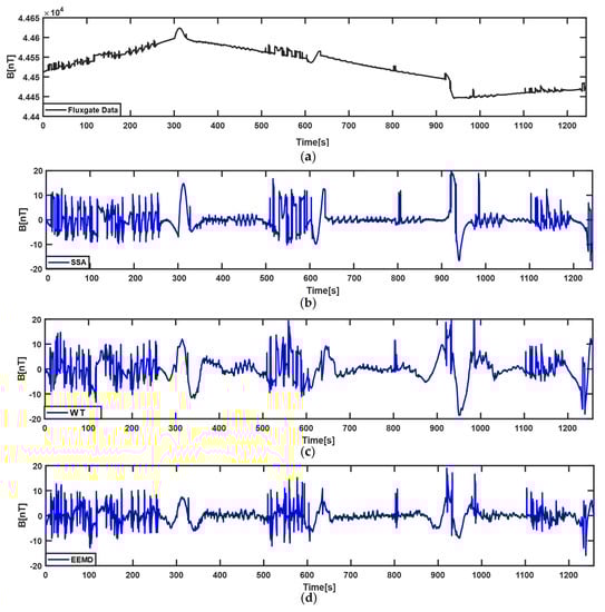 The extraction results of three methods for ECMI of the first–lap. (a) the compensated STMF of the fluxgate vector magnetometer; (b) the characteristic signal of ECMI extracted by SSA; (c) the characteristic signal of ECMI extracted by WT; (d) the characteristic signal of ECMI extracted by EEMD.
