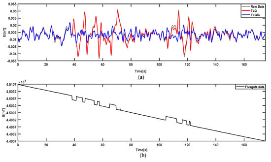 Compensation results of measured magnetic data in low–altitude flight by utilizing TLG and TLGIC_SSA compensation models. (a) low–altitude flight data before and after compensation; (b) compensated total magnetic field data measured by the fluxgate vector magnetometer.