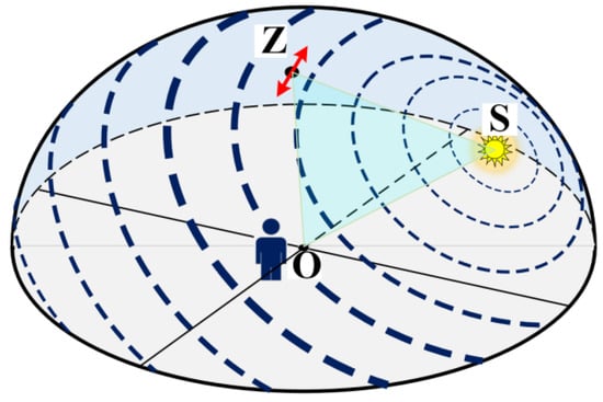 According to the Rayleigh scattering theory, the polarization pattern at any point on the celestial sphere is associated with the sun’s position. Eshelman et al., compared the same set of all-sky images of Stokes parameters and the derived DoP and angle of polarization (AoP) in different planes of reference [21]. The polarization pattern of the full-view skylight is depicted in Figure 1, where O is the observer, Z is the zenith of the celestial sphere, and S stands for the sun. The dashed circle lines indicate the distribution of the polarized direction, which is perpendicular to the plane determined by the sun (the point S), the observer (the point O), and the point observed on the celestial sphere (e.g., point Z in Figure 1). Its orientation indicates the direction of the polarization distribution, and the thickness indicates the relative intensity of the DoP at different positions in the sky. As suggested by the results in Figure 1, the value of DoP reaches a maximum when the angle between OS and OZ is 90 degrees.