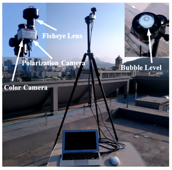 In the experiment, we used a camera based on Sony’s IMX250-MZR polarizing chip to acquire the sky’s polarization pattern in real time. At full resolution (2448 × 2048 pixels), the maximum frame rate is 71 Hz. To obtain the polarization information of the entire sky, we used the fisheye lens (brand: Fujinon; model: FE185C057HA-1; focal length: 1.8 mm) with a 180° view. Another color camera with the same lens was used to simultaneously acquire the color image of the sky to compare the accuracy of the cloud detection results. Figure 3 displays the experimental setup. The bubble level in the figure is used to adjust the camera’s shooting direction to ensure that the camera is always toward the right above.