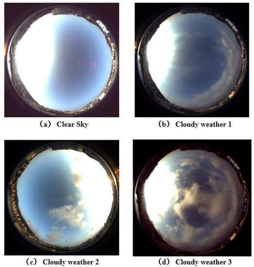 The experimental site is on the roof of the Teaching Building, and the precise location is 120.488479° east longitude and 36.124712° north latitude. The experiment collects the full sky image almost at the same time and place every day. Due to the influence of the Earth’s rotation and revolution, the solar altitude and azimuth will change slightly at the same time every day. During the days of experiments, to eliminate the error caused by the sun’s position, we use the astronomical software to calculate the solar elevation angle every day. The exact acquisition time is adjusted slightly according to the change in the solar altitude to ensure that the images are captured at the same solar altitude. Meanwhile, even if the sun’s elevation angle is identical, the solar azimuth may be different. Fortunately, the influence of the solar azimuth in these images can be easily eliminated by image rotation.
