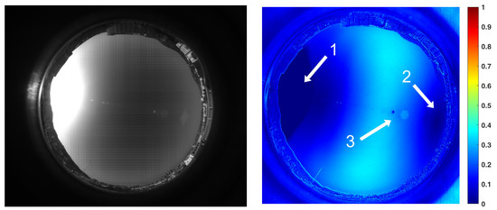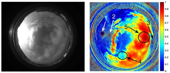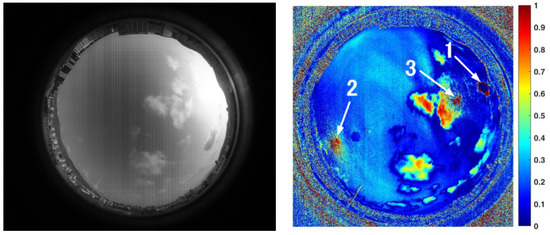 The second set of experiments took place at 17:55:35 on 11 June 2019, when there was a small amount of clouds in the sky. At that moment, the solar elevation and azimuth angles were 13.4926° and 71.1388°, respectively. From these data, we procured the comparison template polarization image of a clear sky with the same solar elevation angle. Figure 9 shows one of the sky images acquired by a polarization camera and its corresponding NPDDI distribution image. Arrow 1 in the figure indicates the overexposed areas, while arrows 2 and 3 indicate the Arago point and the Babinet point of the sky [26,27,28]. At these two points, the polarization of the sky is almost zero, because of which, the cloud detection results represented by the NPDDI are relatively low in accuracy. Owing to the lack of polarization information near the neutral points, cloud detection methods using polarization information may face a similar problem [23]. A comparison of the two figures in Figure 9 shows a good correspondence between the cloud layers and NPDDI contribution, and the high cloud detection accuracy of the entire sky is demonstrated.