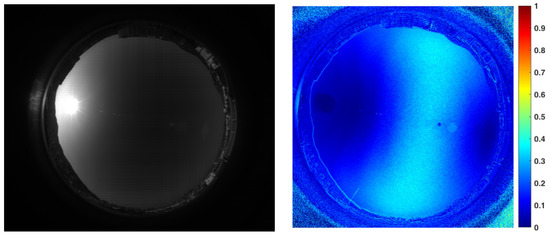 We use the HDR image fusion method based on double exposures to select the best group of macro pixels that obtain the optimum exposure from both the overexposed and underexposed sky images. The complete DoP distribution result can be obtained in the full field of view, as shown in Figure 7. Not only is the overexposed area significantly reduced, but the image noise is obviously suppressed too. By sacrificing shooting efficiency, a non-real-time image sequence with artificially controllable exposure is obtained, and a high calibration accuracy can be guaranteed according to the accurate correspondence between the exposure time and the image intensity. With the method mentioned above, the DoP images are recorded with the sun at different elevation angles in sunny weather, so the comparison database for cloud detection can be established.