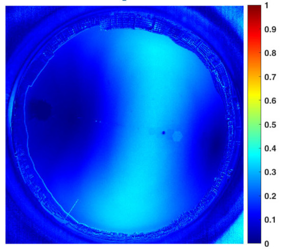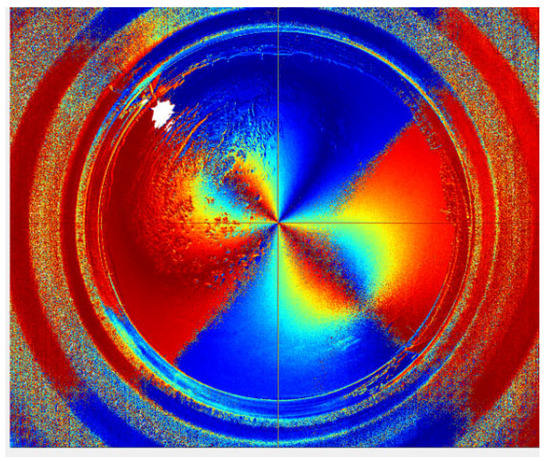 - Considering that the polarization distribution of the sky is a slowly changing process, when we save the image acquired by the polarization camera in .jpeg format, the polarization measurement has a large error with a significant “layering” phenomenon. As shown in Figure 14, since the .jpeg image is compressed, the polarization profile under a clear sky has a certain loss. Therefore, in implementing cloud detection using the polarization camera, it is necessary to save the image in .bmp format, which can ensure accuracy to the greatest extent.