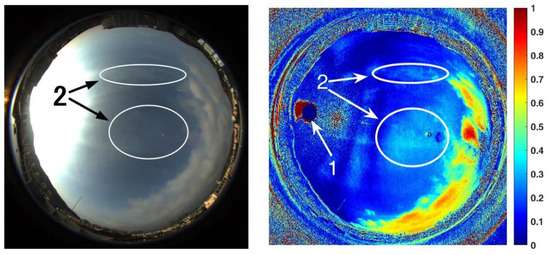 Figure 8 shows a frame of the sky image acquired by a color camera and its corresponding NPDDI distribution image. The different colors in the figure represent different NPDDI values. The areas with higher NPDDI values indicate the existence of cloud, and the larger the NPDDI value, the thicker the cloud layer. The area indicated by arrow 1 is also overexposed by sunlight, and the area with extremely thin clouds in the sky is indicated by arrow 2. The proposed cloud detection algorithm based on the NPDDI method can not only distinguish the thicker clouds from the sky background but also identify the extremely thin clouds. This is a good demonstration of our algorithm’s high sensitivity in cloud detection.