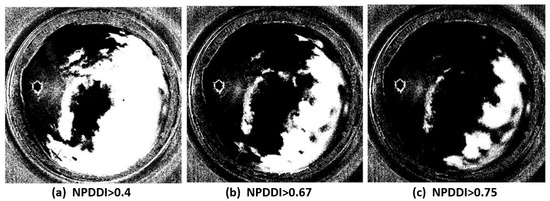 For images in Figure 10, we choose different thresholds of NPDDI to extract clouds thicker than different levels. Figure 11a–c show the cloud screening results, corresponding to the cloud segmentation results when NPDDI is >0.4, >0.67, and >0.75, respectively. The larger the NPDDI value set, the thicker the cloud layer selected, and the smaller the recognition area. The traditional cloud detection methods [13,14,15] use color information to discriminate the cloud layer. Specifically, as long as there are clouds in the sky, the color is certainly different from the sky background, regardless of the cloud’s thickness. Thus, all the areas will be selected irrespective of the optical thickness of the cloud, and the recognition result with the traditional methods is similar to Figure 10. Different from the traditional methods, with the ability of the NPDDI-based cloud detection method to distinguish the cloud optical thickness, we can eliminate the interference by the thin cloud layer and select the truly meaningful cloud layer area. Therefore, the accuracy of the cloud detection result can be significantly improved, which is of great significance for weather forecasting.