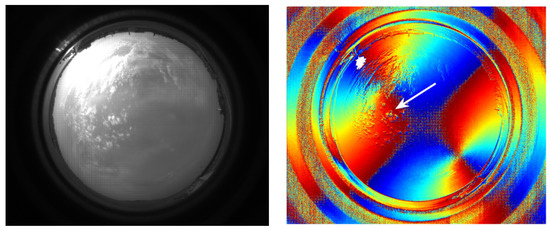 Pust and Shaw pointed out that the deviations of the cloud AoP from the clear-sky pattern depend on the phase of the cloud (composed of liquid or ice crystals), the relative brightness of the scattered light of the cloud, and the blocking of the sun by clouds [23]. In the experiment, we also tried to use the sky polarization angle distribution information to extract the cloud layer from the sky background, but we have not found a suitable method, the main reason being that the interference of the cloud layer in the sky polarization angle distribution has not yet been found to follow a clear law, compared with the sky polarization degree. Figure 12 shows a frame of the all-sky images acquired by the polarization camera and the corresponding polarization angle distribution information. The existence of the cloud layer causes an error in the distribution of the sky polarization angle (as indicated by the white arrow), but this error is not directly related to the optical thickness of the cloud layer.