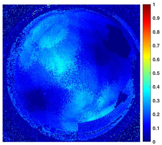 To decrease the overexposed area in the image, we reduce the exposure time in the second capture, and Figure 6 displays the related DoP distribution map obtained. As can be seen from the figure, since most of the areas in the image are underexposed, the DoP distribution result has greater noise compared to Figure 5, which is disadvantageous for the later work of high-precision cloud detection.