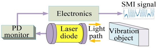 The laser self-mixing interference (SMI) technique [1,2,3] is an important and advanced method for ultra-precision measurements. Many interesting and important fields are inseparable from it, such as human ECG signal detection [4]; spectrum measurement [5,6]; and the measurement of phase, displacement, and vibration [1,7,8,9]. Because the SMI signal can reliably reflect the microvibration of an object, by analyzing the continuous SMI signal, the amplitude and frequency (A and f) of the microvibration of an object can be obtained.