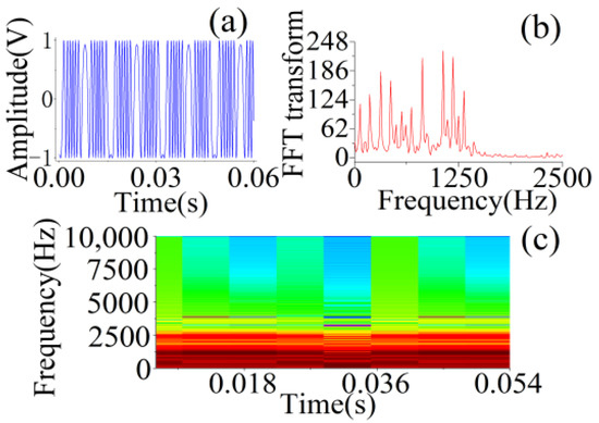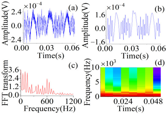 We extracted the features from the experimental signals and performed an analysis. As shown in Figure 7, the actual SMI signal was entrained with a significant amount of noise and contained many burrs. We used wavelet transform [41] to filter the SMI signal such that the curve was smoothed. Next, using Fourier transform and STFT, the spectrum and time-frequency maps were obtained. After Fourier transform, the spectrum of the SMI signal was entrained with noise, which could not be completely eliminated. However, the spectrum maps are also more concentrated in one interval, similar to the spectrum of the simulated signal, which does not affect the extraction of the basic features. After STFT, many features can be extracted from the short-time spectrum within each window function.