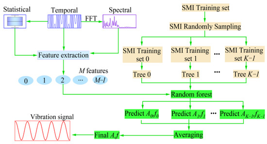 In this study, we propose a method that combines feature extraction and random forest for vibration measurements in SMI. We extracted 367 features with strong interpretation from the original SMI signal and normalized these features into a 0–1 interval as a one-dimensional vector fed into the RF model. With the optimal depth and number of nodes assigned to the decision tree, this feature vector is fed into the pretrained RF to predict A and f of the vibrating signal. The algorithm departs from the traditional idea of vibration measurement by SMI and recovers the original vibration directly from the SMI signal without determining C in advance or estimating other complex parameters.