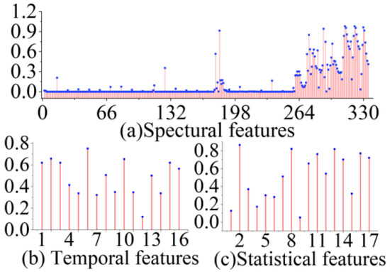 Extracted features from different aspects after normalization. (a) 334 spectral features, (b) 16 temporal features, and (c) 17 statistical features.