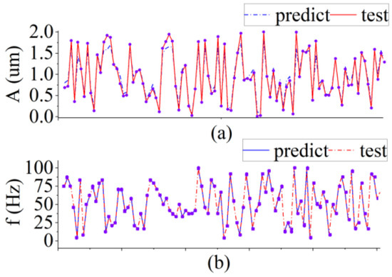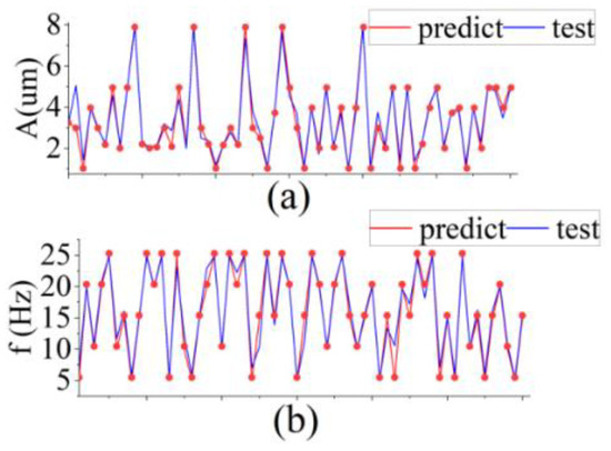 Prediction of A and f in the simulation test. (a) Measurement of A in the range of 0~2 µm. (b) Measurement of f in the range of 0~100 Hz.