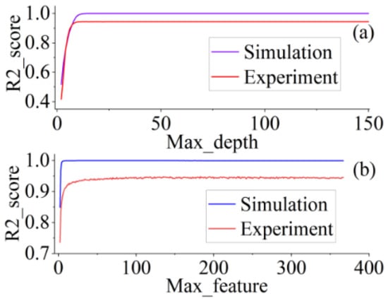 In Figure 9a, when is applied, the RF appears to be overfitted. As the depth of each decision tree continued to increase, the prediction performance of RF steadily improved. Compared with the simulation dataset, the experimental data were affected by the physical environment and contained more noise. After filtering out the noise, although the prediction score was not as high as that of the simulation data, RF achieved an accuracy of more than on the experimental data during . In addition, we analyzed the prediction effect of various Max_features. In Figure 9b, at each node of the decision tree in the forest, we found an optimal subset of features that resulted in the highest accuracy of the RF. Near , starts to enter the flat state. This implies that the minimal length of this feature subset is approximately when the RF achieves optimal performance.