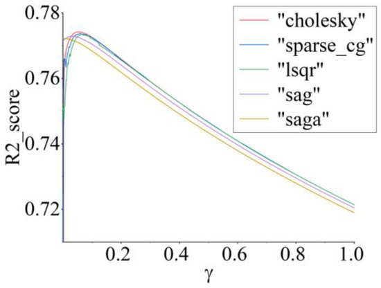 Although ridge does not rely on a large number of decision trees for integrated learning as RF does, its performance relies heavily on the change in the regularization coefficient () and the choice of gradient solver. We used multiple cross-validation methods to continuously modify the value of in the range of 0–1 and evaluated the effect of each pretrained model on the experimental SMI test data. In Figure 11, to solve for the minimum of the loss function of the ridge regressor, we present a plot of with under different gradient descent schemes.