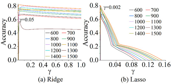 In Figure 12, at , the ability of either ridge or lasso to measure the A and f with the 367 extracted features increases as continues to increase. The degree of underfitting decreased rapidly at this stage, and the model converged faster. However, compared to ridge, the coefficients of lasso can be adjusted in a very narrow range, which easily causes lasso to converge locally, resulting in the highest accuracy at a very low . However, as increases, the accuracy of lasso drops sharply, even to zero, exacerbating the instability of measuring the A and f of the actual vibration. From the analysis of the speed of convergence and stability of the measurement, ridge reached global convergence, although the value of at the highest performance occurred later than that of lasso. During , the accuracy decreases slowly, although the performance of the ridge continues to underfit as increases. This means that in addition to RF, ridge is also useful for any range of stable vibration measurements, not limited to existing A and f. Additionally, in Figure 12, we explored the effectiveness of these algorithms for measuring A and f with different lengths of SMI signals. Although the scoring curves of both algorithms were the lowest at a length of 1300 for the SMI signal, they could be improved by increasing the amount of training data. Overall, the accuracy of these algorithms for measuring A and f gradually increases as the length of the SMI signal increases. This suggests that adjusting the length of the SMI signal can significantly improve the measurements of A and f of the vibrating target using these algorithms.