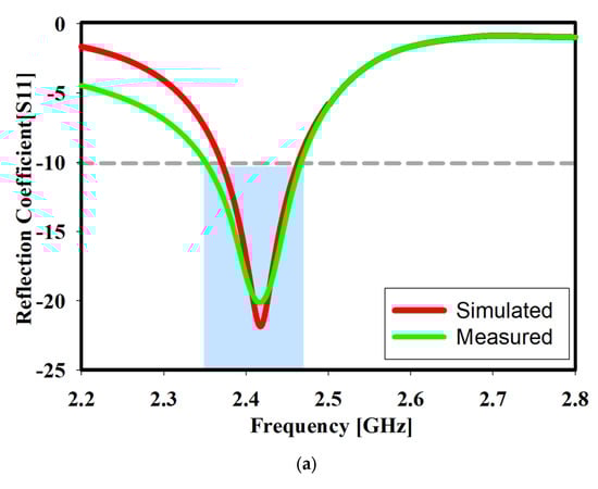 Figure 7 shows a performance comparison between the conventional meander antenna in [32] and the proposed design, which has wider bandwidth. Figure 8a presents the meander line monopole antenna’s simulated and measured reflection coefficients. According to the Figure, the measured and simulated results are reasonably consistent with the perceived difference caused by material and hardware fabrication tolerances. The designed antenna’s bandwidth was discovered to be 94.2 MHz with a frequency range of 2.3685 GHz to 2.4643 GHz at less than −10 dB. Figure 8b presents the reflection coefficient measurement setup.