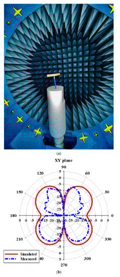 Radiation pattern, both simulated and measured, of the designed antenna operating at 2.4 GHz (a) radiation pattern measurement setup (b) xy, (c) yz, and (d) xz planes.