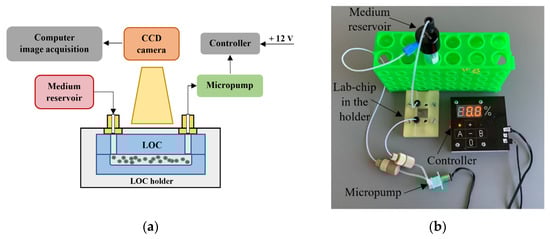 A 15 mL falcon tube for the culturing buffer with the microfluidic adapter (model: LVF-KPT-S-2, Elveflow, Paris, France) ensuring assembly of the microfluidic fittings (model: LVF-KFI-06, Elveflow, Paris, France) is used here as a medium reservoir. Miniaturized peristaltic micropump (model: RP-Q1.5S-P45Z-DC3V, Takasago Fluidic Systems, Nagoya, Japan) is operated by the micropump controller equipped with ATtiny 48 microprocessor (Atmel, Chandler, AZ, USA) to maintain the flow of culturing media in LOC in the range of 250 µL/min. Embedded software of the micropump controller (written in AVR Assembler) manages to command up to 2 micropumps independently. The medium flow is switched herein every 24 h for 20 s. Current flow settings are presented in the LED display of the micropump controller. The power consumption of the lab-on-chip system is circa 2 W (1 W is needed for the micropump operation, and an additional 1 W is used for the micropump controller). The system is powered by 12 V power supply.