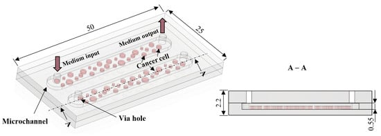 The concept of the LOC for culturing of human cancer cells: top view (on the left), cross-section (on the right). Dimensions are given in millimeters.
