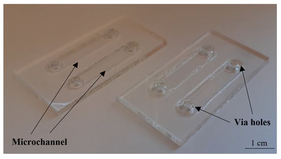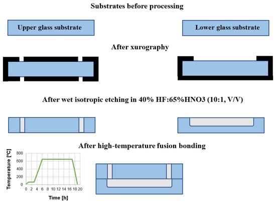 Two borosilicate glass substrates (BOROFLOAT® 33 Schott, Mainz, Germany) of standardized dimensions—50 × 25 × 1.1 mm3 are used herein. Utilizing CAD-based and xurography techniques, a special HF-resistive foil (Avery Dennison Graphics Solutions, Mentor, OH, USA) is CNC-cut and used to mask the slides effectively, thus selective glass micromachining can be performed. In the lower substrate, patterns of microchannels are formed, while in the upper substrate, via holes. Both of the microstructures (microchannels and via holes) are obtained in the process of deep wet isotropic chemical etching in a solution of 40% HF: 65% HNO3, 10:1, v/v. After the removal of the masks, the substrates are thoroughly cleaned to achieve uniform and hermetic structure thanks to the temperature fusion bonding. In this process, special washing procedures with trichloroethylene, acetone, ethanol, and Piranha are employed to prepare the substrates surfaces appropriately. Bonding of the specific temperature profile (Figure 4) is performed in a furnace, utilizing high-temperature conditions (660 °C), ensuring controllable glass reflow within the structure [37]. Utilizing this process, circa 15 structures were fabricated and tested in a reusable way for cell culturing tests. Ready to use LOCs are shown in Figure 5.