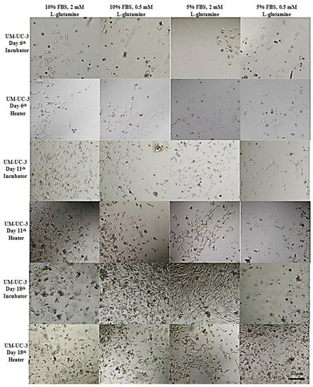 Representative images showing UM-UC-3 cells morphology at given conditions after indicated days of incubation. Incubator 37 °C, 5% CO2 (standard growth conditions); heater 37 °C.
