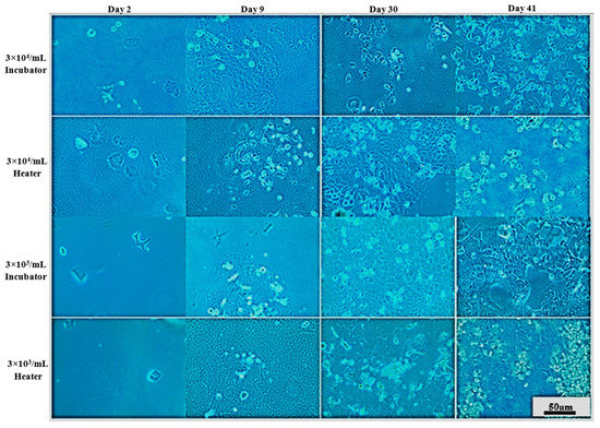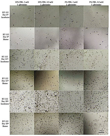 Representative images showing RT-112 cells morphology at given conditions after indicated days of incubation. Incubator 37 °C, 5% CO2 (standard growth conditions); heater 37 °C.