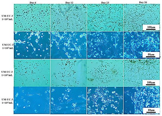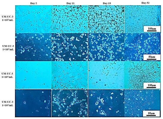 Representative images showing UM-UC-3 cells morphology cultured at room temperature for 14 days (upper panel) and after transfer to the incubator (lower panel).
