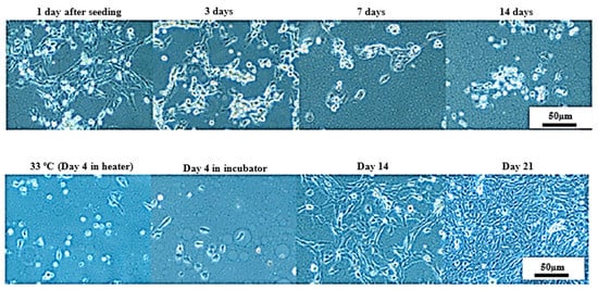 Based on those observations, UM-UC-3 cell line was selected for further studies utilizing LOC platform at room temperature firstly. Initially, the LOCs were placed in the incubator for 2–3 days to promote proper cells attachment (which was confirmed after 24 h). After that, LOCs were transferred to room temperature. After an additional 24 h, cells morphology started to deteriorate with a characteristic increasing amount of rounded and/or detached cells. Limited signs of proliferation were observable. However, after 14 days of the experiment, we still observed some properly attached cells, and thus, the temperature was gradually increased (~2 °C every 24 h) to 37 °C, and eventually LOCs were transferred to the incubator. After 4–5 days in the incubator, cells started to proliferate, resembling the proper morphology until the end of the experiment (after 21 days in the incubator) when a tightly packed cells monolayer was obtained (Figure 12).