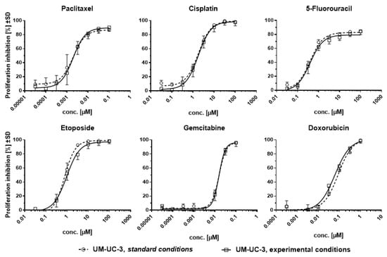 Dose–response curves obtained for UM-UC-3 cells cultured in standard or experimental conditions for 72 h with selected drugs. Curve fitting was carried out using [Inhibitor] vs. response-Variable slope (four parameters) nonlinear model in GraphPad Prism 7.0 software.