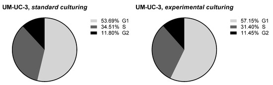 Cell cycle profile observed for UM-UC-3 cells cultured in standard or experimental conditions. Data presented as a percentage of the cells in each phase of the cell cycle. G1 stands for the cell growth stage, S for the DNA synthesis stage, and G2 for pre-mitosis stage.