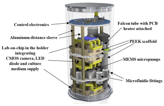 Based on our preliminary experimental results, it seems that our cultivation methodology and LOC platform could be used as a microfluidic payload ensuring cancer cell development in a nanosatellite space mission. In Figure 16, a model of the 2U payload is shown, with a view to the possible arrangement of the LOCs, micropumps, falcon, cameras, etc. All the components were assembled utilizing a so-called scaffold, designed to be fabricated out of Poly-ether-ether-ketone (PEEK) material. In addition to the culturing system presented herein, a miniaturized CMOS camera equipped with a motorized lens is used, as well as a white LED lightning to appropriately view the images of the sample. In order to ensure temperature settings optimal for cancer cell development on-chip (37 °C), flexible PCB heaters are proposed to be attached within the LOCs and falcon areas. Temperature sensors are also placed within the LOCs, in etched cavities. Sealed payload housing, isolated from the external satellite structure, is fabricated out of polished aluminum, to protect the internal experiment from the mechanical damage, vibration, and harsh space atmosphere (temperature changes, radiation flux, and vacuum) during the entire mission time. The outer surface of the housing is adapted for integration into the cubic shape of the satellite platform in the CubeSat standard. Inside the payload, the sensors of temperature, humidity, pressure, and radiation are placed as well. Data exchange with satellite base modules is carried out utilizing CAN (Controller Area Network) bus and Cubesat Space Protocol (CSP). Next, the experimental data are transferred to the Earth Ground Station (GS) for further analysis. The nanosatellite overall structure covers a 3U CubeSat standard, and its mass does not exceed 4 kg. The power consumption of the CubeSat should not exceed 8 W. Our payload arrangement allows for simultaneous experimentation with three LOC structures in space.