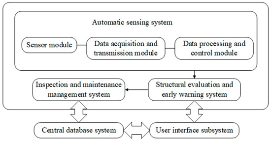- Automatic sensing system, which includes the following three modules. The first is the sensor module. This module serves to control various types of sensing equipment, read structural load data and structural response data, and convert these values into voltage, electric current, or frequency. The second is the data acquisition and transmission module, performing the function of converting the collected electrical signal into a digital signal that can be recognized by the computer and transmitting it to the data processing and control subsystem through the wired and wireless network. The third is the data processing and control module, whose function is to complete data pre-processing, post-processing, archiving, display, and storage.