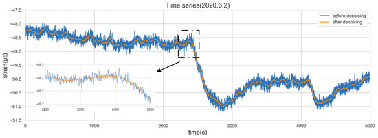 The wavelet threshold denoising method is adopted to eliminate the noise. This study selects the optimal wavelet basis and the number of wavelet decomposition layers by applying the method of calculating the SI index mentioned in the author’s previous paper [14]. In particular, by applying the basis wavelet (Symlet 12) to decompose the original data into five layers, a string of appropriate coefficients and detail coefficients are obtained. Then, a fixed threshold method is used to calculate the wavelet threshold, which is a common method for setting the wavelet threshold in wavelet analysis. The formula is , where N is the signal length. The detail coefficients lower than the threshold are viewed as meaningless noise and set to zero so that the noisy part of the data is removed. Finally, the denoising sequence is reconstructed by an inverse wavelet operation using the detail coefficients of each layer and the appropriate coefficients of the fifth layer.
