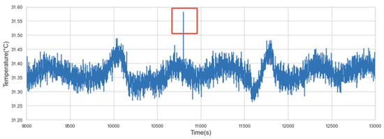 - Point anomaly: If an individual data instance differs greatly from other data, it will be regarded as a point anomaly. The maximum and minimum values in the statistical distribution may likely be considered point anomalies. Figure 5 shows an example of a point anomaly in the structural temperature data. It can be seen that the value in the red box is much higher than the other data.