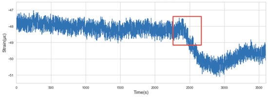 - Contextual anomaly: If an individual data instance differs greatly from its nearby data or within a certain context, it is called a contextual anomaly. Figure 6 shows a contextual anomaly in the concrete strain data. It can be seen that the value in the box has a downward trend against the context where the previous sequence trend is relatively stable.