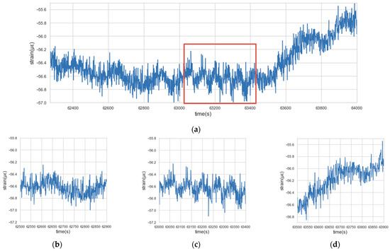 - Collective anomalies: Collective anomalies refer to the situation where a collection of related data instances is anomalous, while the individual instance within the collective anomalies may not be anomalous by themselves. In other words, the collective anomalies happen only in the form of a collective group. Figure 7 shows the collective anomalies in the concrete strain data. In Figure 7a, the frequency of the data instances within the red box is significantly higher than that before or after the red box. Meanwhile, judging from Figure 7b–d separately, there is no anomaly detected.