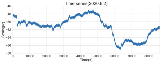In the process of data acquisition, the SHM system will inevitably be affected by environmental noise, the unstable connection between devices, an aging electric grid, unstable wireless transmission speed, channel faults, and so on, which will result in poor data quality. Figure 4 displays an enlarged picture of the concrete strain data. The burr signals can be seen in the sequence, and the changing patterns of data are easily submerged in noise.