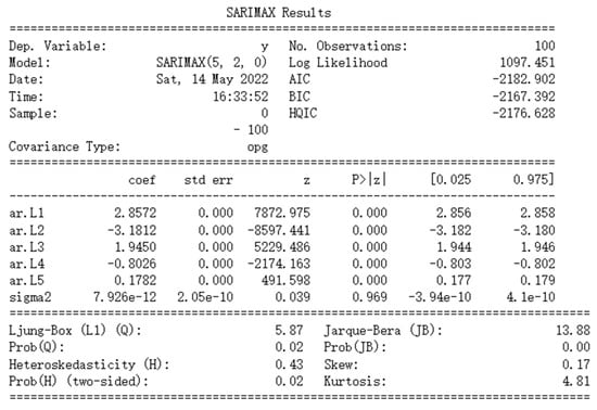 Maximum likelihood estimation is selected for parameter estimation. It is suitable for estimation with large samples as the idea of this method is that the current training sample distribution can represent the population distribution. Figure 9 shows the results of parameter estimation. Among them, coef. Is the list of the model coefficients, where ar.L1 to ar.L5 correspond to to and sigma 2 corresponds to in Equation (8).