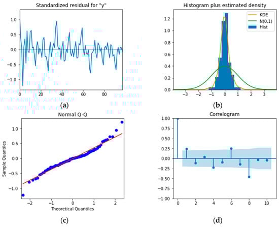 Then, the model’s significance should be examined. The well-fitting model can extract the information contained in the time series, so its residual sequence should be close to the white noise sequence without any specific patterns. Figure 10a shows the timing diagram of the residual sequence, which exhibits strong randomness. Figure 10b,c are a residual distribution plot and quantile-quantile plot, respectively, indicating that the residual basically presents the characteristics of a normal distribution. Figure 10d is the autocorrelation plot of the residuals, which shows there is no obvious autocorrelation between the residuals. In addition, LB statistics were used for the statistical test, and the p-value was , much smaller than 0.05. All of these verify that the residual could be considered as a white noise sequence. Therefore, the model is significant.