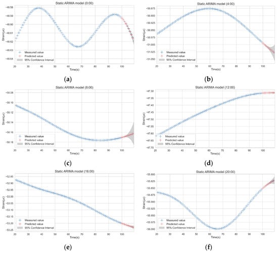 ARIMA prediction at different time periods: (a) Forecast results at 0:00; (b) Forecast results at 4:00; (c) Forecast results at 8:00; (d) Forecast results at 12:00; (e) Forecast results at 16:00; (f) Forecast results at 20:00.