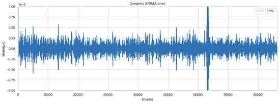 This is because, in essence, multi-step prediction is based on single-step prediction, which means the single-step prediction is used as an input for multi-step prediction. Therefore, the error in single-step prediction will accumulate in each subsequent prediction, resulting in inaccurate multi-step prediction results. For a SHM system, real-time monitoring data are available. In order to improve the accuracy of model prediction and improve the reliability of anomaly detection, the ARIMA algorithm will obtain the measured values in real-time so as to realize a rolling single-step forecast.