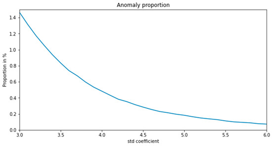 As shown in Figure 14, when the threshold takes different standard deviation coefficients, the proportion of anomalies recognized changes. When the std. coefficient is larger, the threshold is larger, which means the criteria are stricter, so the number of detected anomalies is smaller.
