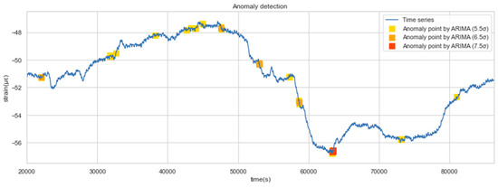 Figure 15 shows the detected anomalies with the above three levels of thresholds. The model gives warning signals at both daily minima and maxima. As the data are changing more dramatically, the warning level is more severe. It should be noted that there are many physical causes of a warning identified by the proposed method, such as the drastic changes in the surrounding environment of the tunnel, the failure of monitoring sensors, or the abnormal conditions of the tunnel structure. Since the actual conditions corresponding to the abnormal signals have not been identified one by one, we can only inform the operation and maintenance authorities that they should pay close attention to the further development of the monitoring value and be prepared for possible structural defects.
