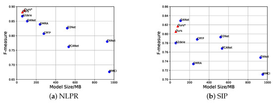 Weighted F-measure and model size on NLPR and SIP datasets. Our lightweight model with simple early fusion can achieve satisfactory detection results over different datasets. Ours and Ours* indicate simple VGG16-based and VGG19-based FPN, respectively.