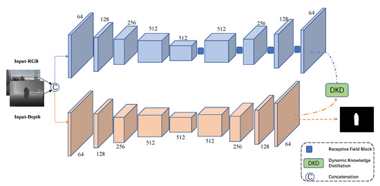Existing methodologies for RGB-D SOD tend to build two-stream networks in order to process RGB and depth features separately. This two-stream design could improve detection performance but meanwhile introduces a large amount of parameters, which increases the complexity and reduces the practicality of models. Feature pyramid network (FPN) [20] is an effective structure which utilizes multi-scale features in different resolutions to achieve detection tasks. Figure 3 illustrates the overall framework, we do not focus on designing networks and only adopt the classic FPN based on a VGG16 and a VGG19 [21] as the student model. In order to obtain a stronger teacher model, we employ four receptive field blocks [22] in multi-scale layers to boost the detection performance. Considering different cross-modal fusion strategies, we choose the simple early fusion way which directly concatenates RGB images and depth images to form four-channel inputs. Similar to normal KD, we transfer the probability distribution of the final layer from the teacher model to the student model by utilizing the so-called DKD.