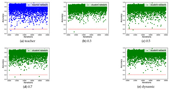 Furthermore, Figure 7 shows detection performance of the student network in different KD weights. It is observed that in the last 10,000 iterations of training stage, the proposed method has better overall accuracy, where the lowest accuracy is still above 0.4, which is even better than the teacher network. Specific examples in Figure 8 illustrates that compared with the DKD, conventional fixed weights suffer from more false positives and negatives. Consequently, it is demonstrated that our DKD adaptively controls the KD in an appropriate way, leading to the improvement of overall detection performance.